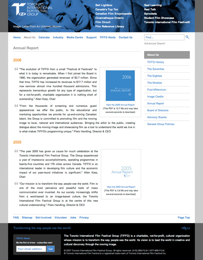 I was only with TIFF for one year, but what a year! It was a tremendously creative environment and there wasn’t an aspect of the endeavor the web team didn’t touch. In addition to group collaboration on the big annual festival, each designer/developer had pet projects. Mine included a redesign of the org’s corporate site, pictured here.