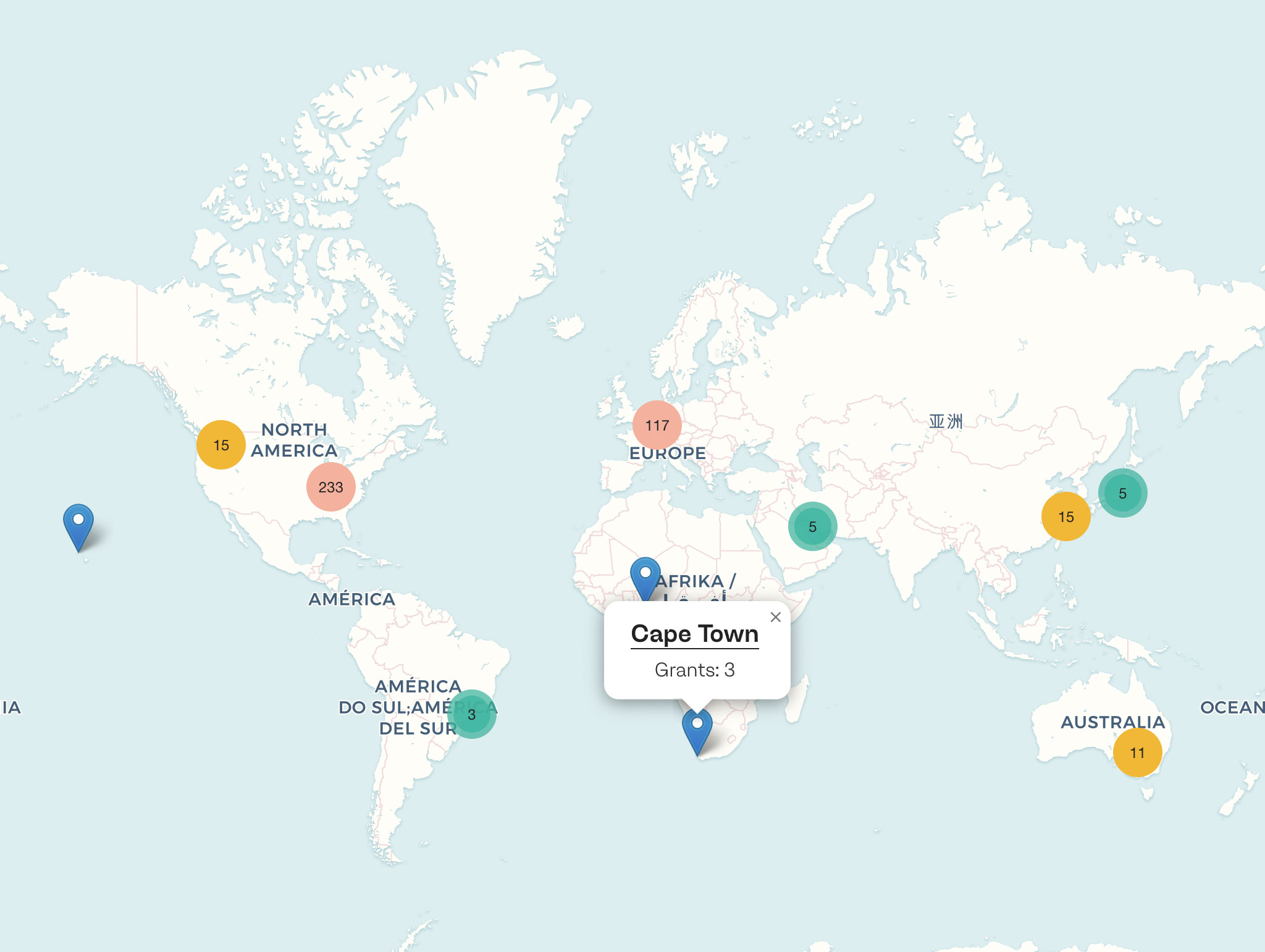 The map uses MarkerCluster to group nearby locations. Cluster icons display the total number of grants for all markers within each cluster, with distinct styles differentiating clusters of fewer than 50 grants from those with 50 or more. Grants are aggregated by location on the server side before the data is sent to the client.