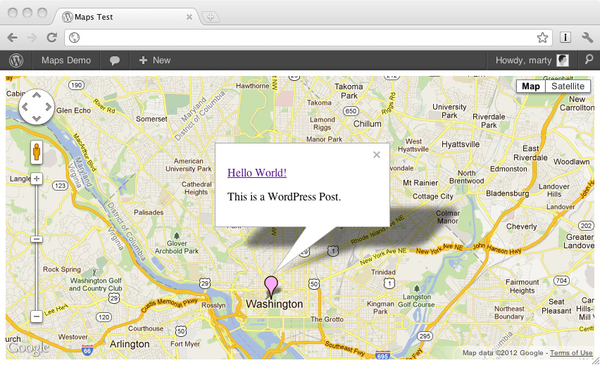 Here we will go through the steps for creating a Google Maps interface for a WordPress blog. Posts will appear as markers on the map, which you can click to reveal the post content in the Google Maps Infowindow.